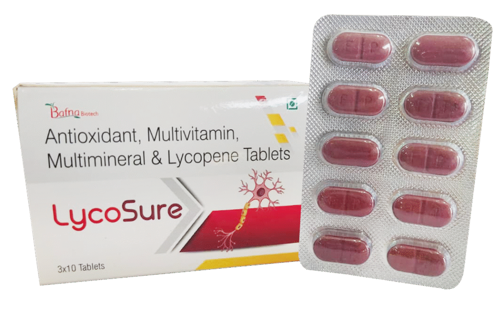Lycosure TAB. COMPOSITION INDICATION PRICE COMPOSITION ANTIOXIDANT, MULTIVITAMIN, MULTIMINERLS & SPIRULINA TAB INDICATION PREVENTS FROM OXIDATIVE STRESS.SUPPORTS HEART HEALTH BY REDUCING LDL.PROMOTES NEW CELL GROWTH.MAINTAIN HEALTHY SKIN.BOOSTS IMMUNITY. PRICE Rs. 186/- Enquiry Now View More Products