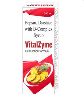 VitalZyme 200 ml COMPOSITION INDICATION PRICE COMPOSITION Pepsin, Diastase with B-Complex Syrup INDICATION SUPPORT HEALTHY DIGESTION.OPTIMIZE THE BREAKDOWN OF FATS.PROMOTE OPTIMAL NUTRIENT ABSORPTION.REDUCE GAS, BLOATING, INDIGESTION, AND CONSTIPATION FOLLOWING MEALS.HELP YOUR BODY PROCESS DIFFICULT TO DIGEST FOODS. PRICE Rs. 162/- Enquiry Now View More Products